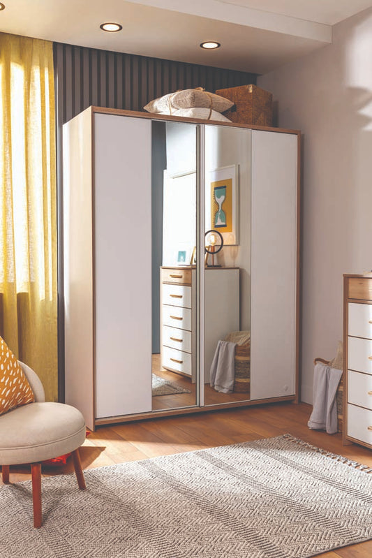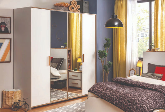 Modera 4-türiger Kleiderschrank Drehtürenschrank mit Spiegel Weiß