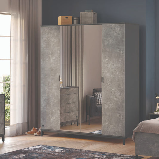 Space Gray 4-türiger Kleiderschrank mit Spiegeltüren Grau