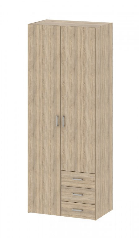 - Kleiderschrank mit 2 Türen und 3 Schubladen auf Kunststoffschienen. Hinter der rechten Tür befinden sich 4 Ablagefächer. Links 1 Fachboden und 1 Kleiderstange. Griffe aus Kunststoff.