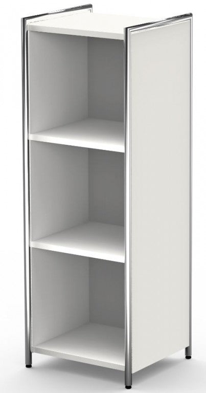 Die Regalseiten verfügen über ein dreiseitig umlaufendes verchromtes Rundrohr in 22 mm Stärke, welches mit einer 19 mm starken Holzwange aus melaminharzbeschichteter Gütespanplatte in anthrazit oder weiß gefüllt ist. Auf Wunsch können die Regalfelder mit Türen aus Holz (2 OH und 5 OH) oder Glas (2 OH) ergänzt werden, die ober- und unterhalb durch verchromte Rundrohre, 22 mm Ø, eingerahmt werden. Sämtliche Holztüren verfügen über ein Drehzylinderschloss und verchromte 105 mm lange Griffe, sowie einen Öffnungsgrad von 90 .Die Rollcontainer sind mit Stahlschubladen mit Selbsteinzug, Zentralverschluss und Auszugsperre ausgestattet.