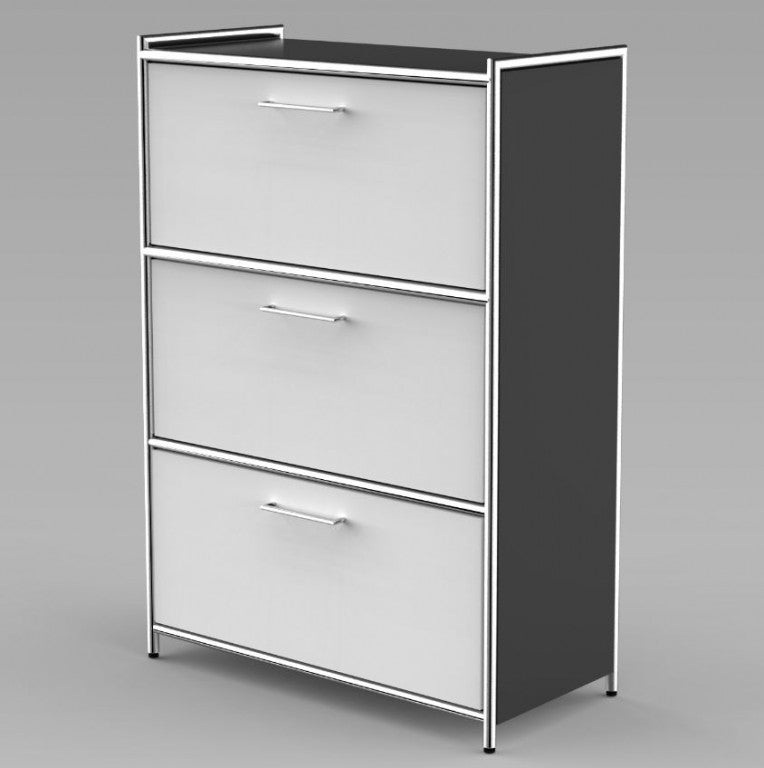 Die Regalseiten verfügen über ein dreiseitig umlaufendes verchromtes Rundrohr in 22 mm Stärke, welches mit einer 19 mm starken Holzwange aus melaminharzbeschichteter Gütespanplatte in anthrazit oder weiß gefüllt ist. Auf Wunsch können die Regalfelder mit Türen aus Holz (2 OH und 5 OH) oder Glas (2 OH) ergänzt werden, die ober- und unterhalb durch verchromte Rundrohre, 22 mm Ø, eingerahmt werden. Sämtliche Holztüren verfügen über ein Drehzylinderschloss und verchromte 105 mm lange Griffe, sowie einen Öffnungsgrad von 90 .Die Rollcontainer sind mit Stahlschubladen mit Selbsteinzug, Zentralverschluss und Auszugsperre ausgestattet.