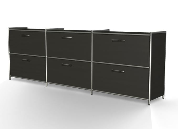 Die Regalseiten verfügen über ein dreiseitig umlaufendes verchromtes Rundrohr in 22 mm Stärke, welches mit einer 19 mm starken Holzwange aus melaminharzbeschichteter Gütespanplatte in anthrazit oder weiß gefüllt ist. Auf Wunsch können die Regalfelder mit Türen aus Holz (2 OH und 5 OH) oder Glas (2 OH) ergänzt werden, die ober- und unterhalb durch verchromte Rundrohre, 22 mm Ø, eingerahmt werden. Sämtliche Holztüren verfügen über ein Drehzylinderschloss und verchromte 105 mm lange Griffe, sowie einen Öffnungsgrad von 90 .Die Rollcontainer sind mit Stahlschubladen mit Selbsteinzug, Zentralverschluss und Auszugsperre ausgestattet.