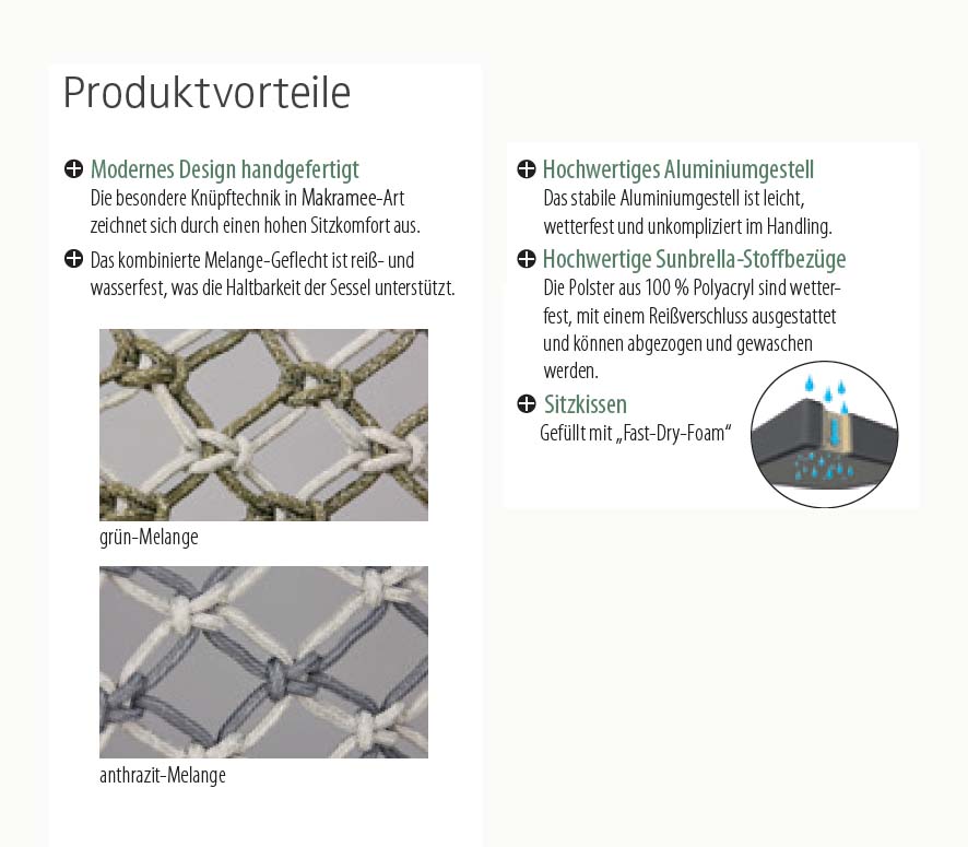 - Sitz- und Rückenpolster mit Fast-Dry-Foam befüllt und somit wasserabweisend