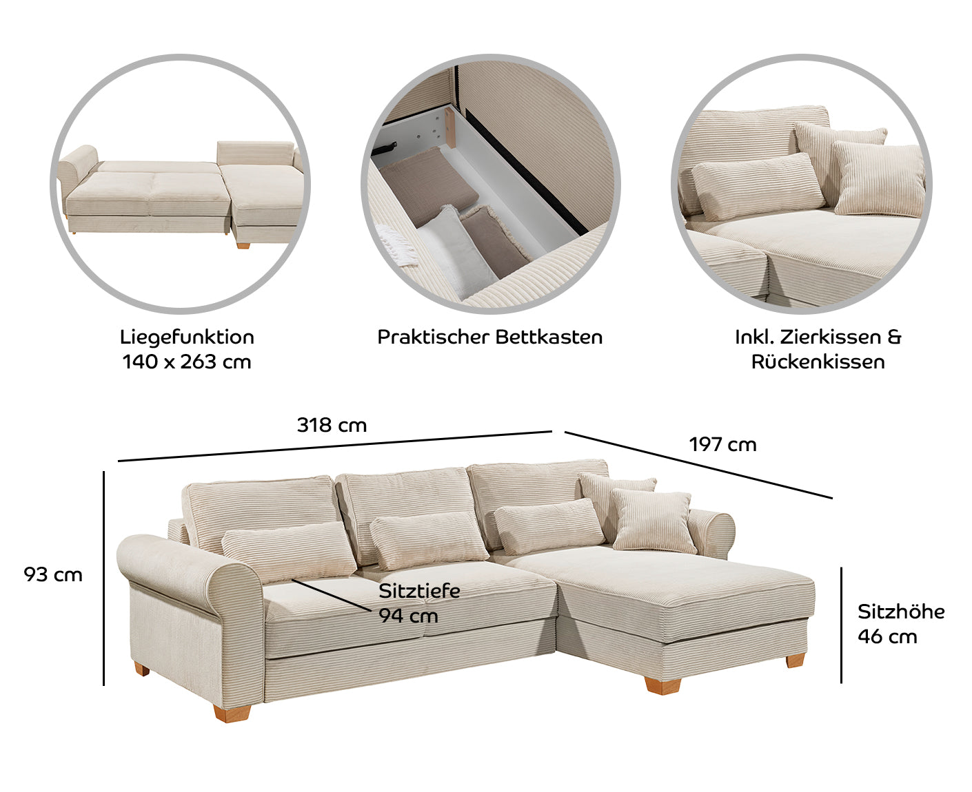 Angelo Ecksofa 318 x 197 cm, mit Schlaffunktion & Bettkasten