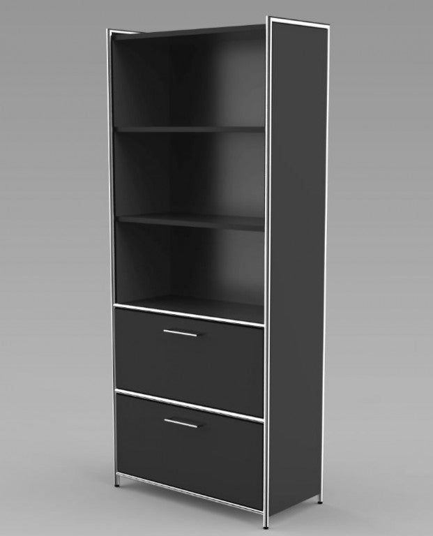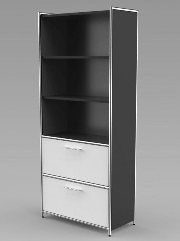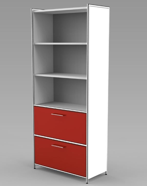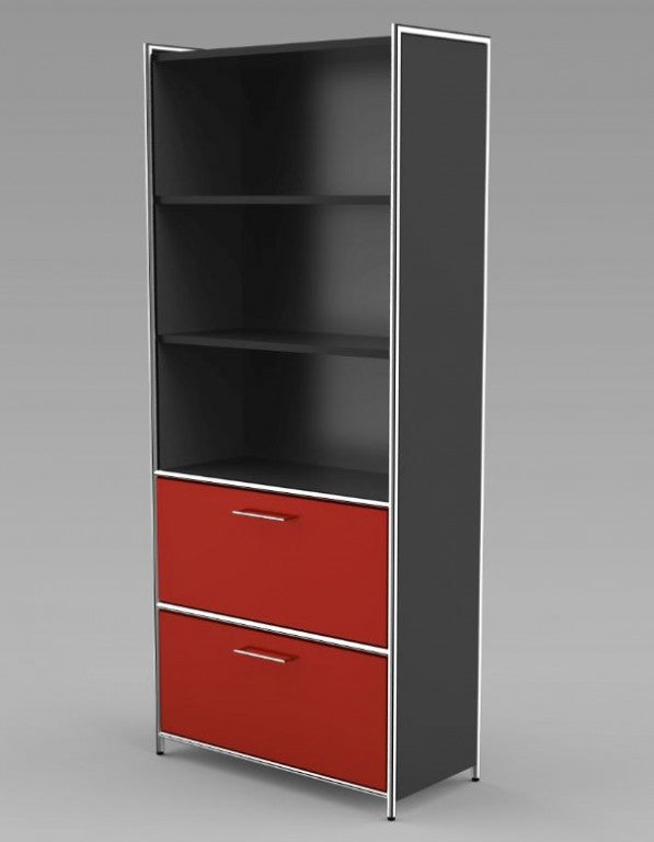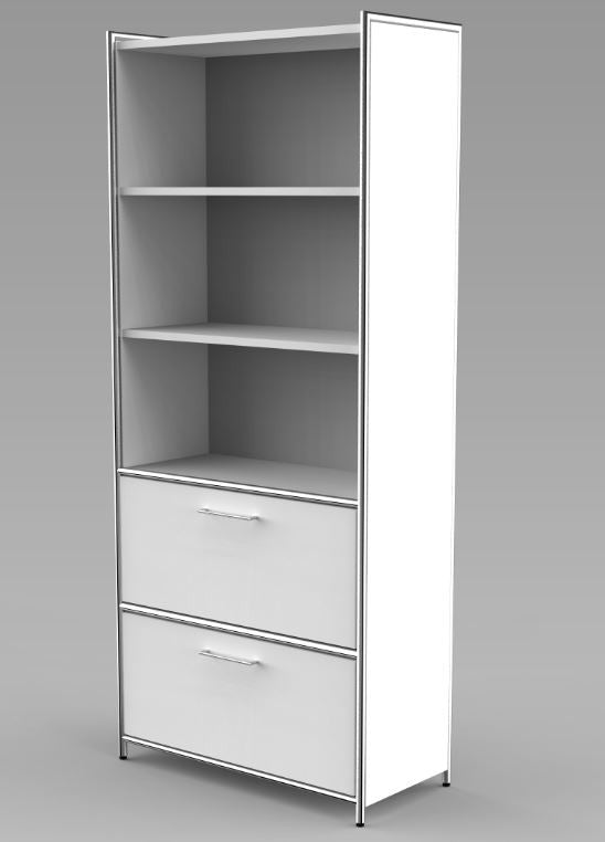 Die Regalseiten verfügen über ein dreiseitig umlaufendes verchromtes Rundrohr in 22 mm Stärke, welches mit einer 19 mm starken Holzwange aus melaminharzbeschichteter Gütespanplatte in anthrazit oder weiß gefüllt ist. Auf Wunsch können die Regalfelder mit Türen aus Holz (2 OH und 5 OH) oder Glas (2 OH) ergänzt werden, die ober- und unterhalb durch verchromte Rundrohre, 22 mm Ø, eingerahmt werden. Sämtliche Holztüren verfügen über ein Drehzylinderschloss und verchromte 105 mm lange Griffe, sowie einen Öffnungsgrad von 90 .Die Rollcontainer sind mit Stahlschubladen mit Selbsteinzug, Zentralverschluss und Auszugsperre ausgestattet.