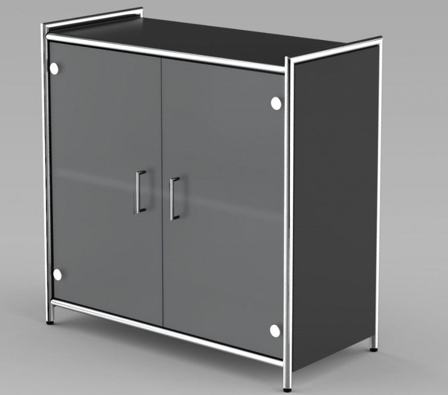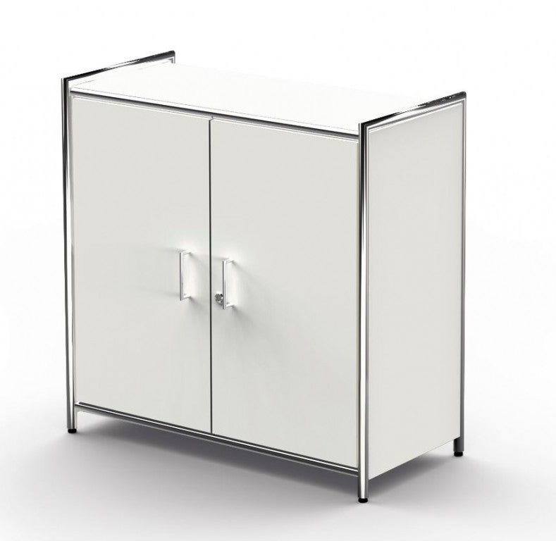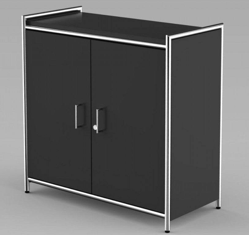 Die Regalseiten verfügen über ein dreiseitig umlaufendes verchromtes Rundrohr in 22 mm Stärke, welches mit einer 19 mm starken Holzwange aus melaminharzbeschichteter Gütespanplatte in anthrazit oder weiß gefüllt ist. Auf Wunsch können die Regalfelder mit Türen aus Holz (2 OH und 5 OH) oder Glas (2 OH) ergänzt werden, die ober- und unterhalb durch verchromte Rundrohre, 22 mm Ø, eingerahmt werden. Sämtliche Holztüren verfügen über ein Drehzylinderschloss und verchromte 105 mm lange Griffe, sowie einen Öffnungsgrad von 90 .Die Rollcontainer sind mit Stahlschubladen mit Selbsteinzug, Zentralverschluss und Auszugsperre ausgestattet.