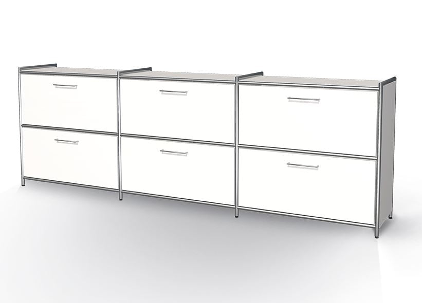 Die Regalseiten verfügen über ein dreiseitig umlaufendes verchromtes Rundrohr in 22 mm Stärke, welches mit einer 19 mm starken Holzwange aus melaminharzbeschichteter Gütespanplatte in anthrazit oder weiß gefüllt ist. Auf Wunsch können die Regalfelder mit Türen aus Holz (2 OH und 5 OH) oder Glas (2 OH) ergänzt werden, die ober- und unterhalb durch verchromte Rundrohre, 22 mm Ø, eingerahmt werden. Sämtliche Holztüren verfügen über ein Drehzylinderschloss und verchromte 105 mm lange Griffe, sowie einen Öffnungsgrad von 90 .Die Rollcontainer sind mit Stahlschubladen mit Selbsteinzug, Zentralverschluss und Auszugsperre ausgestattet.