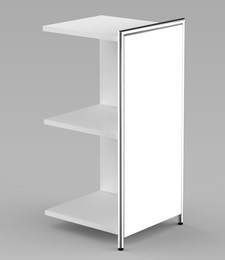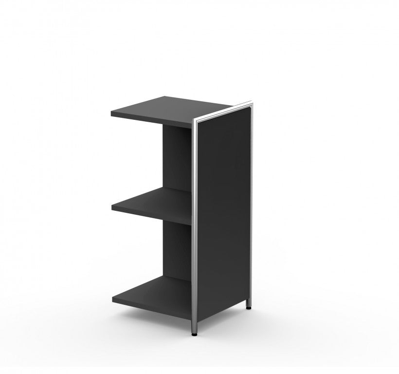 Die Regalseiten verfügen über ein dreiseitig umlaufendes verchromtes Rundrohr in 22 mm Stärke, welches mit einer 19 mm starken Holzwange aus melaminharzbeschichteter Gütespanplatte in anthrazit oder weiß gefüllt ist. Auf Wunsch können die Regalfelder mit Türen aus Holz (2 OH und 5 OH) oder Glas (2 OH) ergänzt werden, die ober- und unterhalb durch verchromte Rundrohre, 22 mm Ø, eingerahmt werden. Sämtliche Holztüren verfügen über ein Drehzylinderschloss und verchromte 105 mm lange Griffe, sowie einen Öffnungsgrad von 90 .Die Rollcontainer sind mit Stahlschubladen mit Selbsteinzug, Zentralverschluss und Auszugsperre ausgestattet.