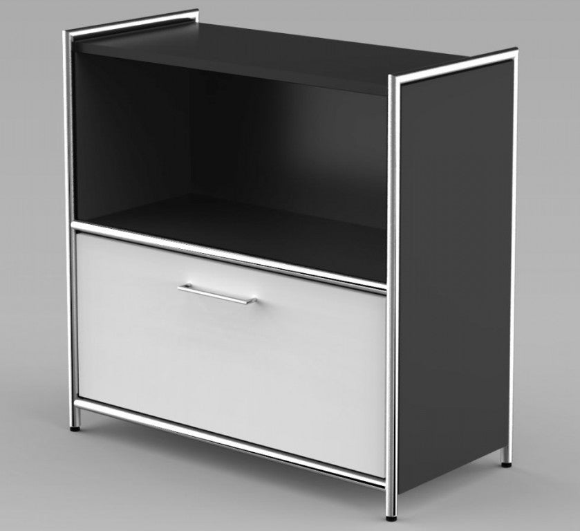 Die Regalseiten verfügen über ein dreiseitig umlaufendes verchromtes Rundrohr in 22 mm Stärke, welches mit einer 19 mm starken Holzwange aus melaminharzbeschichteter Gütespanplatte in anthrazit oder weiß gefüllt ist. Auf Wunsch können die Regalfelder mit Türen aus Holz (2 OH und 5 OH) oder Glas (2 OH) ergänzt werden, die ober- und unterhalb durch verchromte Rundrohre, 22 mm Ø, eingerahmt werden. Sämtliche Holztüren verfügen über ein Drehzylinderschloss und verchromte 105 mm lange Griffe, sowie einen Öffnungsgrad von 90 .Die Rollcontainer sind mit Stahlschubladen mit Selbsteinzug, Zentralverschluss und Auszugsperre ausgestattet.