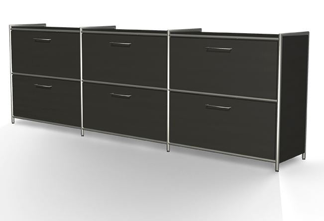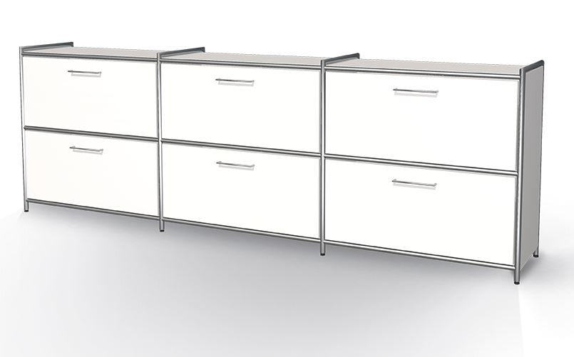 Die Regalseiten verfügen über ein dreiseitig umlaufendes verchromtes Rundrohr in 22 mm Stärke, welches mit einer 19 mm starken Holzwange aus melaminharzbeschichteter Gütespanplatte in anthrazit oder weiß gefüllt ist. Auf Wunsch können die Regalfelder mit Türen aus Holz (2 OH und 5 OH) oder Glas (2 OH) ergänzt werden, die ober- und unterhalb durch verchromte Rundrohre, 22 mm Ø, eingerahmt werden. Sämtliche Holztüren verfügen über ein Drehzylinderschloss und verchromte 105 mm lange Griffe, sowie einen Öffnungsgrad von 90 .Die Rollcontainer sind mit Stahlschubladen mit Selbsteinzug, Zentralverschluss und Auszugsperre ausgestattet.
