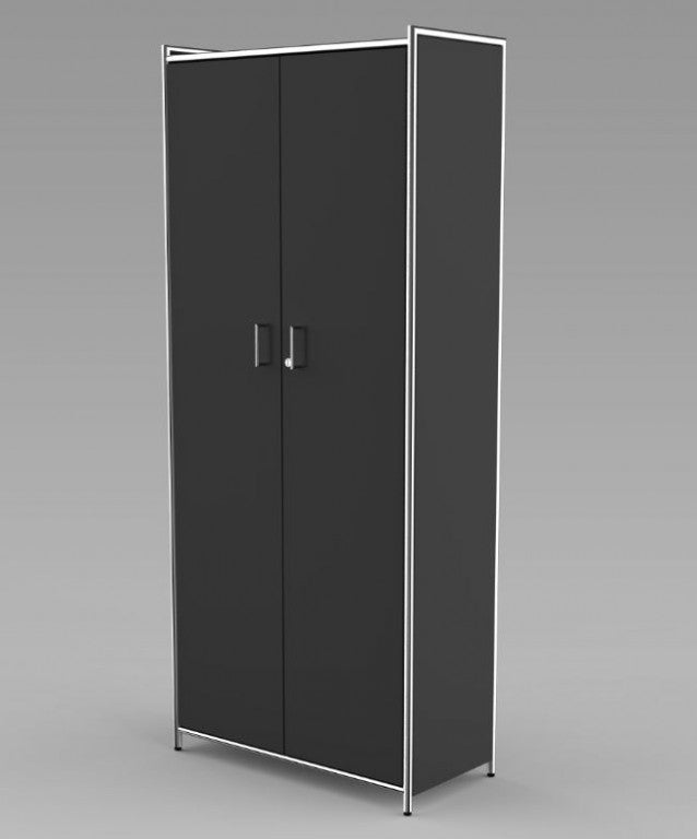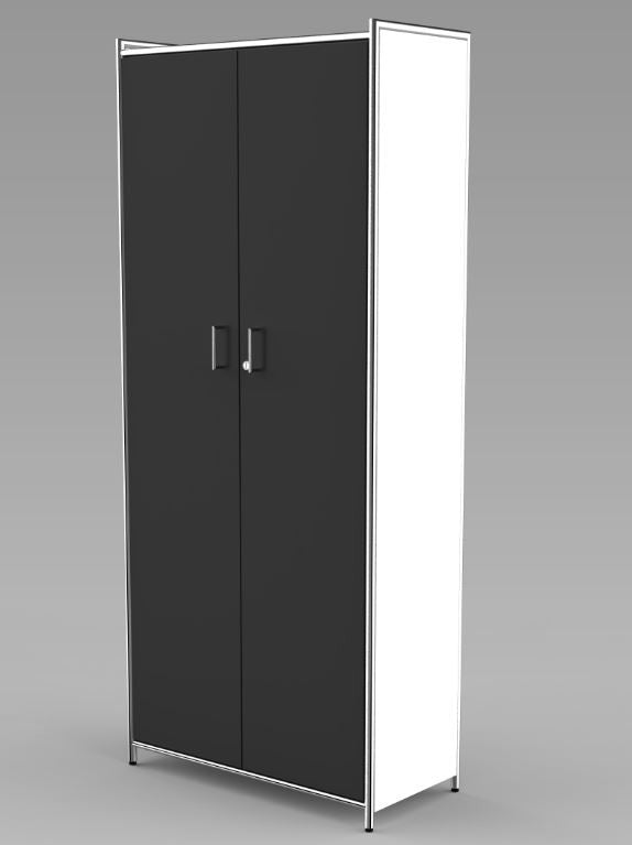 Die Regalseiten verfügen über ein dreiseitig umlaufendes verchromtes Rundrohr in 22 mm Stärke, welches mit einer 19 mm starken Holzwange aus melaminharzbeschichteter Gütespanplatte in anthrazit oder weiß gefüllt ist. Auf Wunsch können die Regalfelder mit Türen aus Holz (2 OH und 5 OH) oder Glas (2 OH) ergänzt werden, die ober- und unterhalb durch verchromte Rundrohre, 22 mm Ø, eingerahmt werden. Sämtliche Holztüren verfügen über ein Drehzylinderschloss und verchromte 105 mm lange Griffe, sowie einen Öffnungsgrad von 90 .Die Rollcontainer sind mit Stahlschubladen mit Selbsteinzug, Zentralverschluss und Auszugsperre ausgestattet.