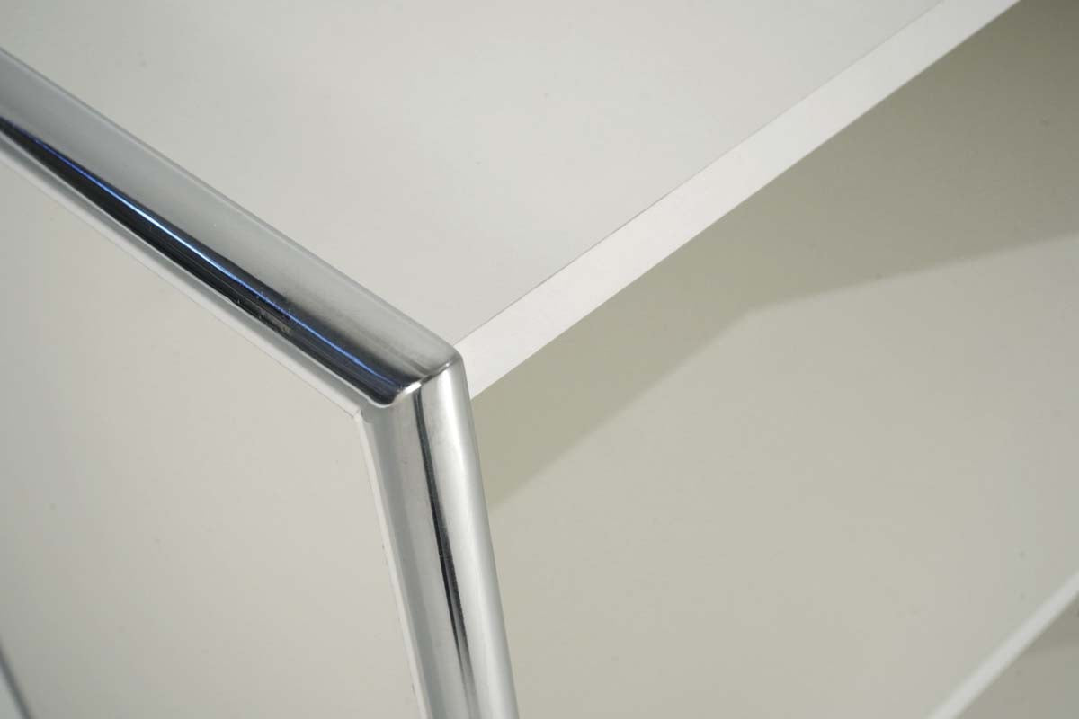 Die Regalseiten verfügen über ein dreiseitig umlaufendes verchromtes Rundrohr in 22 mm Stärke, welches mit einer 19 mm starken Holzwange aus melaminharzbeschichteter Gütespanplatte in anthrazit oder weiß gefüllt ist. Auf Wunsch können die Regalfelder mit Türen aus Holz (2 OH und 5 OH) oder Glas (2 OH) ergänzt werden, die ober- und unterhalb durch verchromte Rundrohre, 22 mm Ø, eingerahmt werden. Sämtliche Holztüren verfügen über ein Drehzylinderschloss und verchromte 105 mm lange Griffe, sowie einen Öffnungsgrad von 90 .Die Rollcontainer sind mit Stahlschubladen mit Selbsteinzug, Zentralverschluss und Auszugsperre ausgestattet.