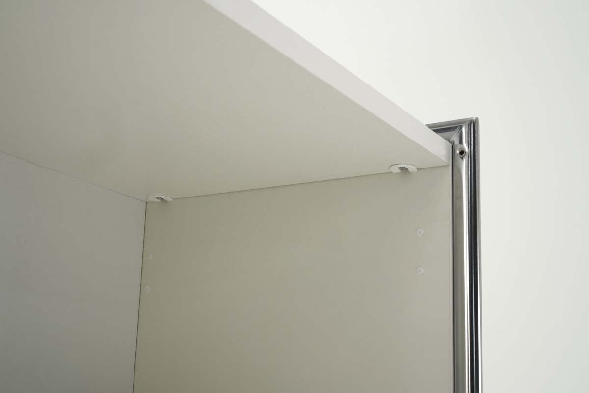 Die Regalseiten verfügen über ein dreiseitig umlaufendes verchromtes Rundrohr in 22 mm Stärke, welches mit einer 19 mm starken Holzwange aus melaminharzbeschichteter Gütespanplatte in anthrazit oder weiß gefüllt ist. Auf Wunsch können die Regalfelder mit Türen aus Holz (2 OH und 5 OH) oder Glas (2 OH) ergänzt werden, die ober- und unterhalb durch verchromte Rundrohre, 22 mm Ø, eingerahmt werden. Sämtliche Holztüren verfügen über ein Drehzylinderschloss und verchromte 105 mm lange Griffe, sowie einen Öffnungsgrad von 90 .Die Rollcontainer sind mit Stahlschubladen mit Selbsteinzug, Zentralverschluss und Auszugsperre ausgestattet.
