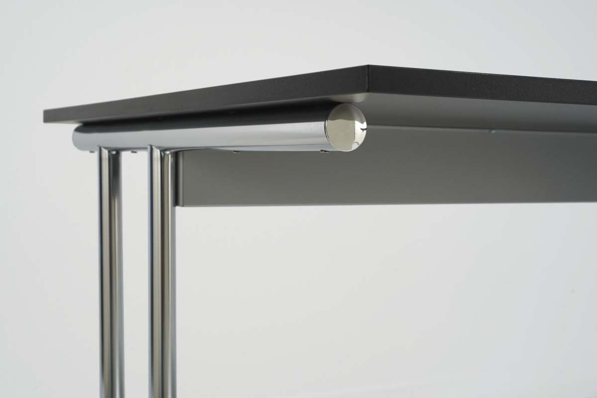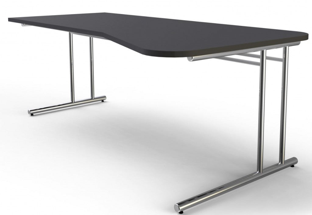 Stilvolles und repräsentatives Büromöbelprogramm, das durch den Materialmix aus Holz und verchromtem Stahlrohr besticht. Die Schreibtische, mit C-Fuß-Gestell bestehen aus einem Chromrohrrahmen mit 28/32 mm Ø (Standrohr) bzw. 38 mm Ø (Fußausleger) und lassen sich von 68 - 82 cm in der Höhe verstellen. Wählen Sie zwischen Tischplatten aus Holz in 2 verschiedenen Farben (Anthrazit oder Weiß aus E1 Gütespanplatten, melaminharzbeschichtet, mit 2 mm ABS-Kante) in 3 verschiedenen Tischbreiten (1200, 1600 und 1800 mm), jeweils mit einem Kabelkanal unter der Tischplatte zur Aufnahme von Steckdosenleisten etc. oder Tischplatten aus satiniertem ESG-Glas, 8 mm stark, in 2 verschiedenen Tischbreiten ( 1200 und 1600 mm). Ergänzt werden die Tische mit Holzplatten durch einen extragroßen Schreibtisch in 2000 x 1000 mm, den Winkelkombinationen (bestehend aus dem jeweiligen Schreibtisch und einem Anbautisch 1000 x 600 mm) einem Freiformtisch, einen Besprechungsansatztisch, einer Verkettungsplatte und einen Besprechungstisch für bis zu 6 Personen. Dank des stabilen Tischplatten-Unterbaus aus Stahl beträgt die erforderliche Tischplattenstärke nur 19 mm. Dies verleiht dem Tisch ein ästhetisches Aussehen und vermittelt eine gewisse Leichtfüßigkeit.Die Schreibtische verfügen über eine Höhenverstellung von 62-82 cm.