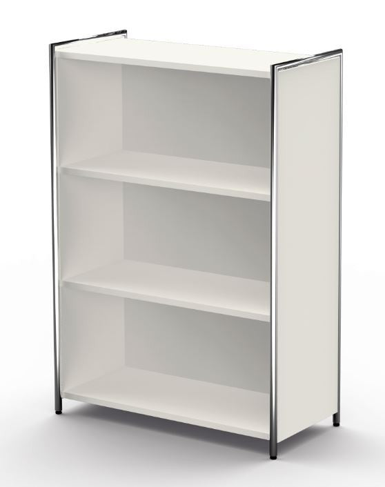 Die Regalseiten verfügen über ein dreiseitig umlaufendes verchromtes Rundrohr in 22 mm Stärke, welches mit einer 19 mm starken Holzwange aus melaminharzbeschichteter Gütespanplatte in anthrazit oder weiß gefüllt ist. Auf Wunsch können die Regalfelder mit Türen aus Holz (2 OH und 5 OH) oder Glas (2 OH) ergänzt werden, die ober- und unterhalb durch verchromte Rundrohre, 22 mm Ø, eingerahmt werden. Sämtliche Holztüren verfügen über ein Drehzylinderschloss und verchromte 105 mm lange Griffe, sowie einen Öffnungsgrad von 90 .Die Rollcontainer sind mit Stahlschubladen mit Selbsteinzug, Zentralverschluss und Auszugsperre ausgestattet.