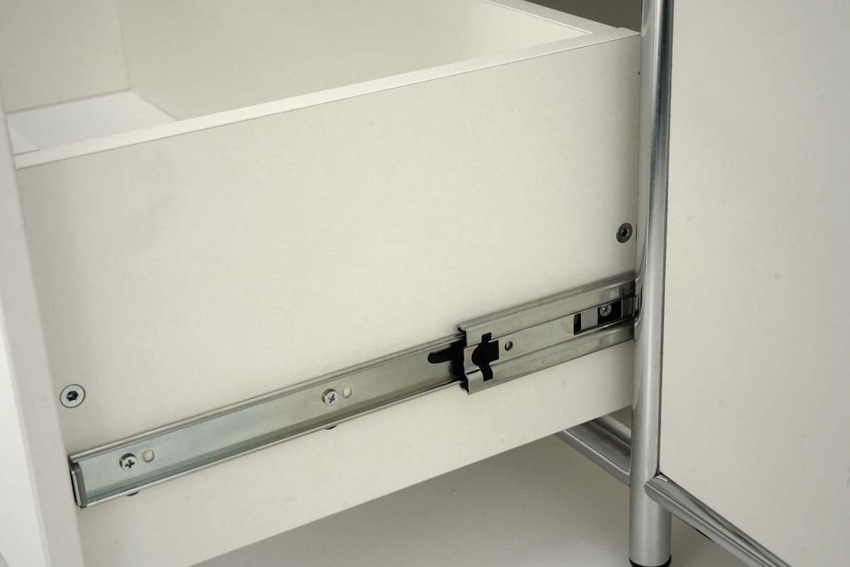 Die Regalseiten verfügen über ein dreiseitig umlaufendes verchromtes Rundrohr in 22 mm Stärke, welches mit einer 19 mm starken Holzwange aus melaminharzbeschichteter Gütespanplatte in anthrazit oder weiß gefüllt ist. Auf Wunsch können die Regalfelder mit Türen aus Holz (2 OH und 5 OH) oder Glas (2 OH) ergänzt werden, die ober- und unterhalb durch verchromte Rundrohre, 22 mm Ø, eingerahmt werden. Sämtliche Holztüren verfügen über ein Drehzylinderschloss und verchromte 105 mm lange Griffe, sowie einen Öffnungsgrad von 90 .Die Rollcontainer sind mit Stahlschubladen mit Selbsteinzug, Zentralverschluss und Auszugsperre ausgestattet.