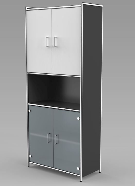 Die Regalseiten verfügen über ein dreiseitig umlaufendes verchromtes Rundrohr in 22 mm Stärke, welches mit einer 19 mm starken Holzwange aus melaminharzbeschichteter Gütespanplatte in anthrazit oder weiß gefüllt ist. Auf Wunsch können die Regalfelder mit Türen aus Holz (2 OH und 5 OH) oder Glas (2 OH) ergänzt werden, die ober- und unterhalb durch verchromte Rundrohre, 22 mm Ø, eingerahmt werden. Sämtliche Holztüren verfügen über ein Drehzylinderschloss und verchromte 105 mm lange Griffe, sowie einen Öffnungsgrad von 90 .Die Rollcontainer sind mit Stahlschubladen mit Selbsteinzug, Zentralverschluss und Auszugsperre ausgestattet.