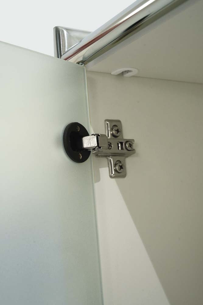 Die Regalseiten verfügen über ein dreiseitig umlaufendes verchromtes Rundrohr in 22 mm Stärke, welches mit einer 19 mm starken Holzwange aus melaminharzbeschichteter Gütespanplatte in anthrazit oder weiß gefüllt ist. Auf Wunsch können die Regalfelder mit Türen aus Holz (2 OH und 5 OH) oder Glas (2 OH) ergänzt werden, die ober- und unterhalb durch verchromte Rundrohre, 22 mm Ø, eingerahmt werden. Sämtliche Holztüren verfügen über ein Drehzylinderschloss und verchromte 105 mm lange Griffe, sowie einen Öffnungsgrad von 90 .Die Rollcontainer sind mit Stahlschubladen mit Selbsteinzug, Zentralverschluss und Auszugsperre ausgestattet.