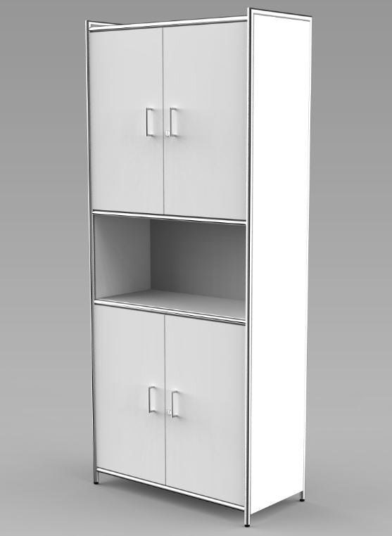 Die Regalseiten verfügen über ein dreiseitig umlaufendes verchromtes Rundrohr in 22 mm Stärke, welches mit einer 19 mm starken Holzwange aus melaminharzbeschichteter Gütespanplatte in anthrazit oder weiß gefüllt ist. Auf Wunsch können die Regalfelder mit Türen aus Holz (2 OH und 5 OH) oder Glas (2 OH) ergänzt werden, die ober- und unterhalb durch verchromte Rundrohre, 22 mm Ø, eingerahmt werden. Sämtliche Holztüren verfügen über ein Drehzylinderschloss und verchromte 105 mm lange Griffe, sowie einen Öffnungsgrad von 90 .Die Rollcontainer sind mit Stahlschubladen mit Selbsteinzug, Zentralverschluss und Auszugsperre ausgestattet.