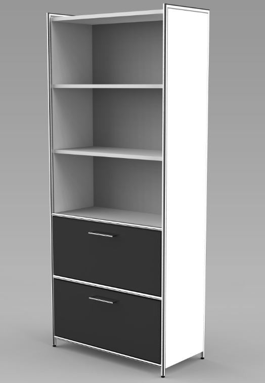 Die Regalseiten verfügen über ein dreiseitig umlaufendes verchromtes Rundrohr in 22 mm Stärke, welches mit einer 19 mm starken Holzwange aus melaminharzbeschichteter Gütespanplatte in anthrazit oder weiß gefüllt ist. Auf Wunsch können die Regalfelder mit Türen aus Holz (2 OH und 5 OH) oder Glas (2 OH) ergänzt werden, die ober- und unterhalb durch verchromte Rundrohre, 22 mm Ø, eingerahmt werden. Sämtliche Holztüren verfügen über ein Drehzylinderschloss und verchromte 105 mm lange Griffe, sowie einen Öffnungsgrad von 90 .Die Rollcontainer sind mit Stahlschubladen mit Selbsteinzug, Zentralverschluss und Auszugsperre ausgestattet.