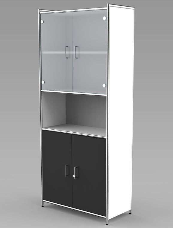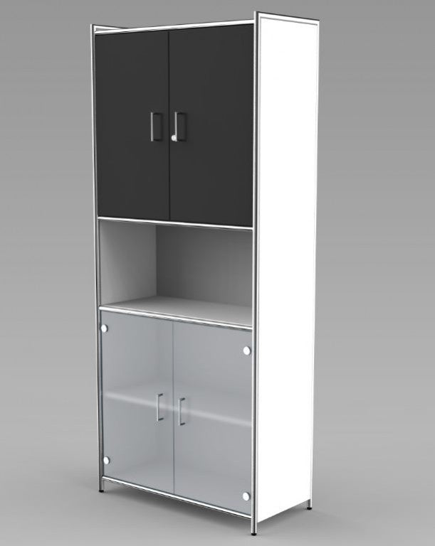 Die Regalseiten verfügen über ein dreiseitig umlaufendes verchromtes Rundrohr in 22 mm Stärke, welches mit einer 19 mm starken Holzwange aus melaminharzbeschichteter Gütespanplatte in anthrazit oder weiß gefüllt ist. Auf Wunsch können die Regalfelder mit Türen aus Holz (2 OH und 5 OH) oder Glas (2 OH) ergänzt werden, die ober- und unterhalb durch verchromte Rundrohre, 22 mm Ø, eingerahmt werden. Sämtliche Holztüren verfügen über ein Drehzylinderschloss und verchromte 105 mm lange Griffe, sowie einen Öffnungsgrad von 90 .Die Rollcontainer sind mit Stahlschubladen mit Selbsteinzug, Zentralverschluss und Auszugsperre ausgestattet.