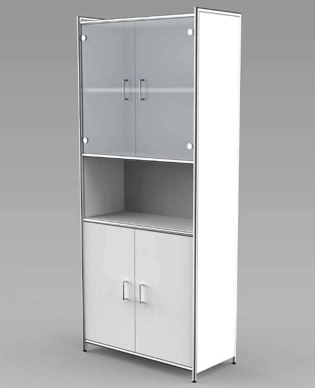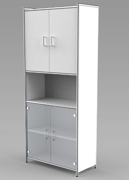 Die Regalseiten verfügen über ein dreiseitig umlaufendes verchromtes Rundrohr in 22 mm Stärke, welches mit einer 19 mm starken Holzwange aus melaminharzbeschichteter Gütespanplatte in anthrazit oder weiß gefüllt ist. Auf Wunsch können die Regalfelder mit Türen aus Holz (2 OH und 5 OH) oder Glas (2 OH) ergänzt werden, die ober- und unterhalb durch verchromte Rundrohre, 22 mm Ø, eingerahmt werden. Sämtliche Holztüren verfügen über ein Drehzylinderschloss und verchromte 105 mm lange Griffe, sowie einen Öffnungsgrad von 90 .Die Rollcontainer sind mit Stahlschubladen mit Selbsteinzug, Zentralverschluss und Auszugsperre ausgestattet.