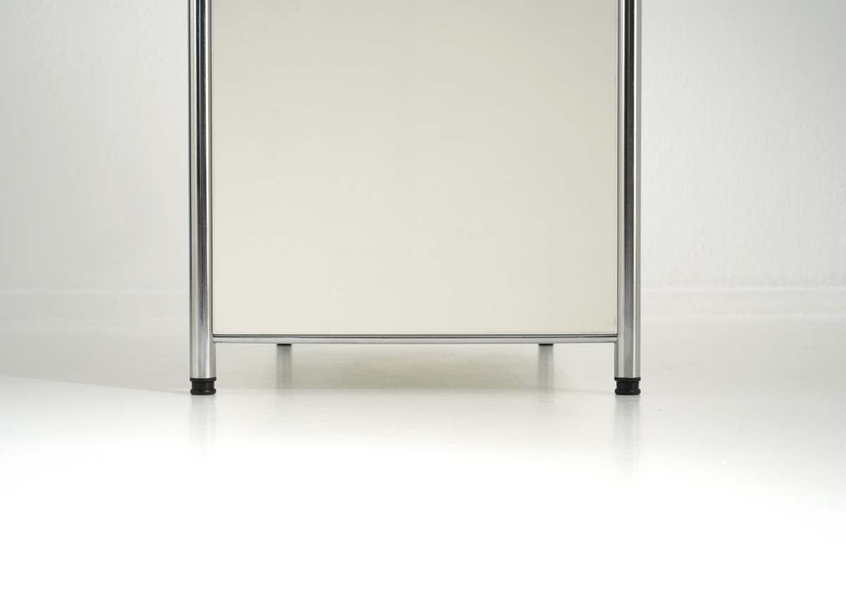 Die Regalseiten verfügen über ein dreiseitig umlaufendes verchromtes Rundrohr in 22 mm Stärke, welches mit einer 19 mm starken Holzwange aus melaminharzbeschichteter Gütespanplatte in anthrazit oder weiß gefüllt ist. Auf Wunsch können die Regalfelder mit Türen aus Holz (2 OH und 5 OH) oder Glas (2 OH) ergänzt werden, die ober- und unterhalb durch verchromte Rundrohre, 22 mm Ø, eingerahmt werden. Sämtliche Holztüren verfügen über ein Drehzylinderschloss und verchromte 105 mm lange Griffe, sowie einen Öffnungsgrad von 90 .Die Rollcontainer sind mit Stahlschubladen mit Selbsteinzug, Zentralverschluss und Auszugsperre ausgestattet.