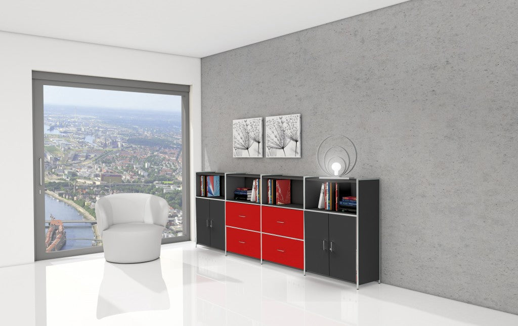 Die Regalseiten verfügen über ein dreiseitig umlaufendes verchromtes Rundrohr in 22 mm Stärke, welches mit einer 19 mm starken Holzwange aus melaminharzbeschichteter Gütespanplatte in anthrazit oder weiß gefüllt ist. Auf Wunsch können die Regalfelder mit Türen aus Holz (2 OH und 5 OH) oder Glas (2 OH) ergänzt werden, die ober- und unterhalb durch verchromte Rundrohre, 22 mm Ø, eingerahmt werden. Sämtliche Holztüren verfügen über ein Drehzylinderschloss und verchromte 105 mm lange Griffe, sowie einen Öffnungsgrad von 90 .Die Rollcontainer sind mit Stahlschubladen mit Selbsteinzug, Zentralverschluss und Auszugsperre ausgestattet.