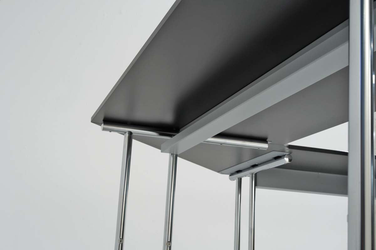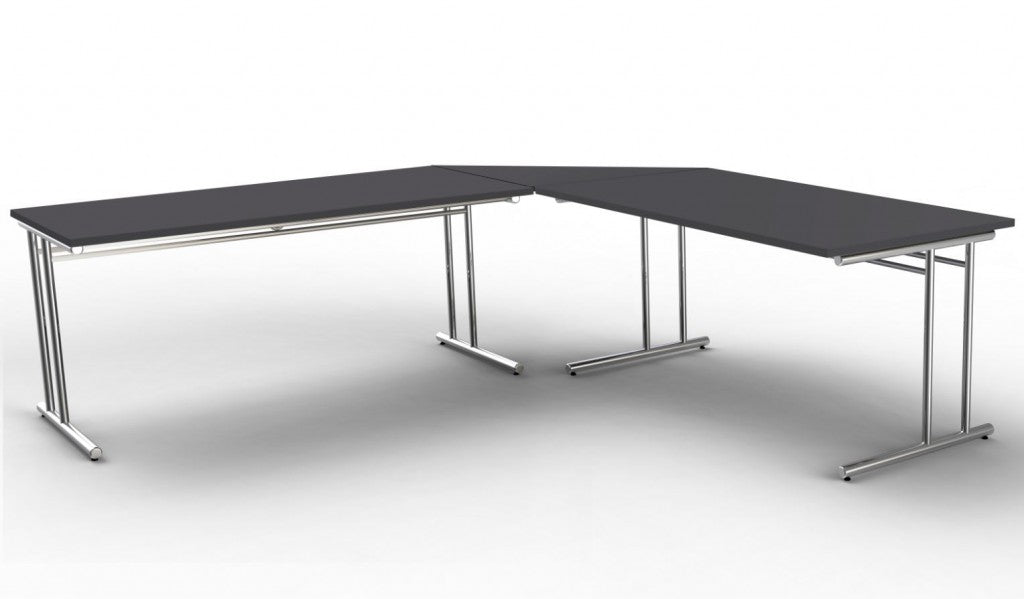 Stilvolles und repräsentatives Büromöbelprogramm, das durch den Materialmix aus Holz und verchromtem Stahlrohr besticht. Die Schreibtische, mit C-Fuß-Gestell bestehen aus einem Chromrohrrahmen mit 28/32 mm Ø (Standrohr) bzw. 38 mm Ø (Fußausleger) und lassen sich von 68 - 82 cm in der Höhe verstellen. Wählen Sie zwischen Tischplatten aus Holz in 2 verschiedenen Farben (Anthrazit oder Weiß aus E1 Gütespanplatten, melaminharzbeschichtet, mit 2 mm ABS-Kante) in 3 verschiedenen Tischbreiten (1200, 1600 und 1800 mm), jeweils mit einem Kabelkanal unter der Tischplatte zur Aufnahme von Steckdosenleisten etc. oder Tischplatten aus satiniertem ESG-Glas, 8 mm stark, in 2 verschiedenen Tischbreiten ( 1200 und 1600 mm). Ergänzt werden die Tische mit Holzplatten durch einen extragroßen Schreibtisch in 2000 x 1000 mm, den Winkelkombinationen (bestehend aus dem jeweiligen Schreibtisch und einem Anbautisch 1000 x 600 mm) einem Freiformtisch, einen Besprechungsansatztisch, einer Verkettungsplatte und einen Besprechungstisch für bis zu 6 Personen. Dank des stabilen Tischplatten-Unterbaus aus Stahl beträgt die erforderliche Tischplattenstärke nur 19 mm. Dies verleiht dem Tisch ein ästhetisches Aussehen und vermittelt eine gewisse Leichtfüßigkeit.Die Schreibtische verfügen über eine Höhenverstellung von 62-82 cm.