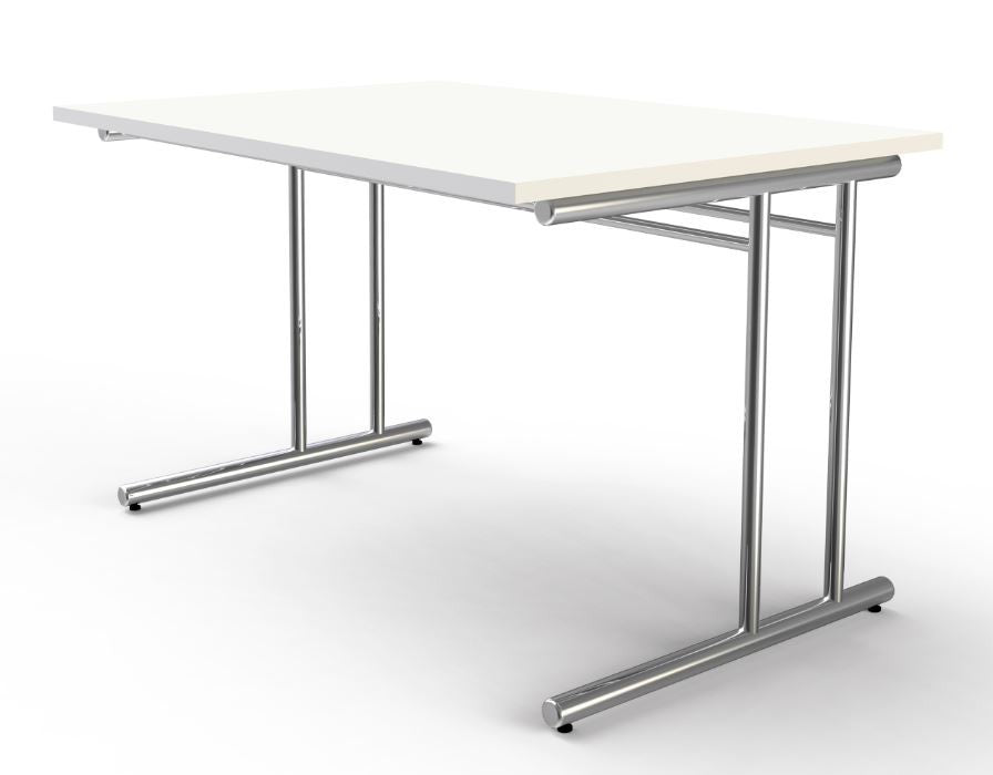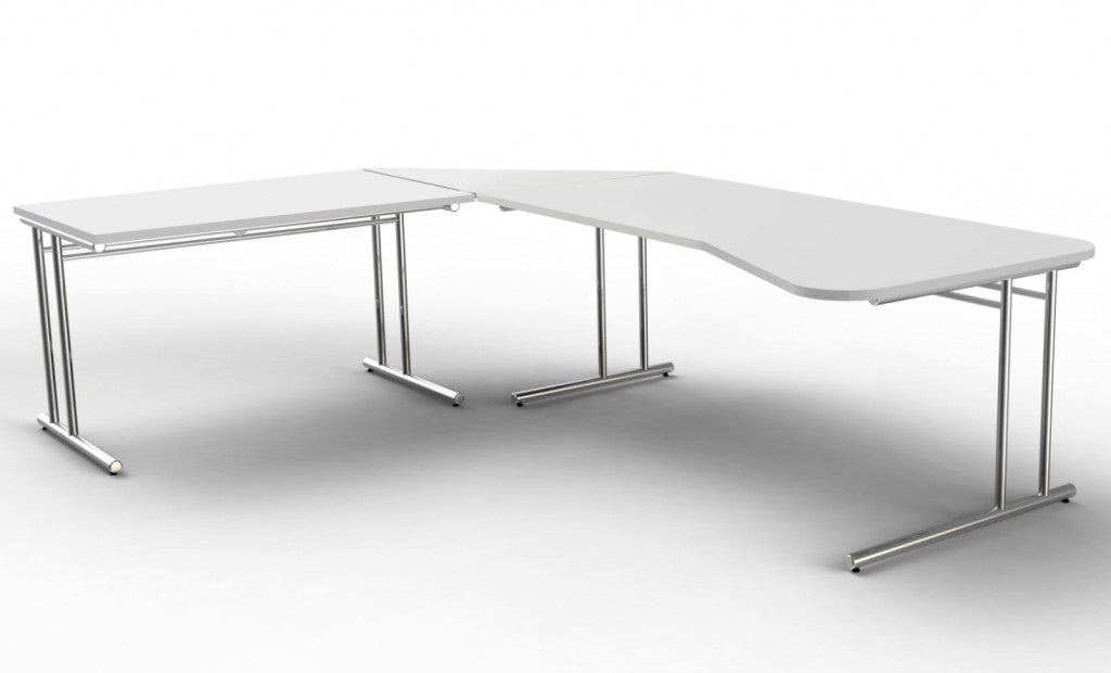 Stilvolles und repräsentatives Büromöbelprogramm, das durch den Materialmix aus Holz und verchromtem Stahlrohr besticht. Die Schreibtische, mit C-Fuß-Gestell bestehen aus einem Chromrohrrahmen mit 28/32 mm Ø (Standrohr) bzw. 38 mm Ø (Fußausleger) und lassen sich von 68 - 82 cm in der Höhe verstellen. Wählen Sie zwischen Tischplatten aus Holz in 2 verschiedenen Farben (Anthrazit oder Weiß aus E1 Gütespanplatten, melaminharzbeschichtet, mit 2 mm ABS-Kante) in 3 verschiedenen Tischbreiten (1200, 1600 und 1800 mm), jeweils mit einem Kabelkanal unter der Tischplatte zur Aufnahme von Steckdosenleisten etc. oder Tischplatten aus satiniertem ESG-Glas, 8 mm stark, in 2 verschiedenen Tischbreiten ( 1200 und 1600 mm). Ergänzt werden die Tische mit Holzplatten durch einen extragroßen Schreibtisch in 2000 x 1000 mm, den Winkelkombinationen (bestehend aus dem jeweiligen Schreibtisch und einem Anbautisch 1000 x 600 mm) einem Freiformtisch, einen Besprechungsansatztisch, einer Verkettungsplatte und einen Besprechungstisch für bis zu 6 Personen. Dank des stabilen Tischplatten-Unterbaus aus Stahl beträgt die erforderliche Tischplattenstärke nur 19 mm. Dies verleiht dem Tisch ein ästhetisches Aussehen und vermittelt eine gewisse Leichtfüßigkeit.Die Schreibtische verfügen über eine Höhenverstellung von 62-82 cm.