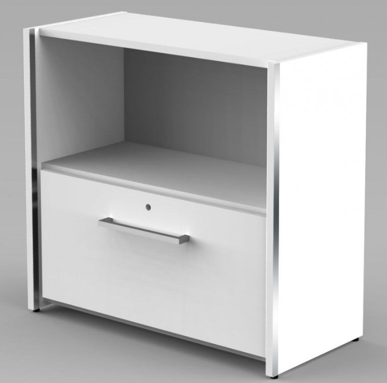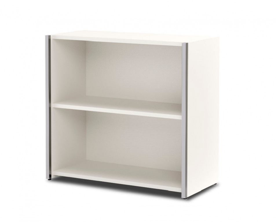 Die Regale können sowohl einzeln als auch aneinandergebaut aufgestellt werden (Ersparnis von Seitenwangen). Die Fachhöhen sind auf Ordnerhöhen abgestimmt. Der Regalkorpus ist stets in Weiß und wird zum Schrank, wenn er mit Vorbautüren versehen wird. Diese gibt es in Weiß, Wenge, Anthrazit und Glas. Die Regalwangen werden durch Edelstahlstreifen optisch aufgewertet, und passen so ideal zu den Tischgestellen. Die Türen sind mit Edelstahlgriffen versehen.
