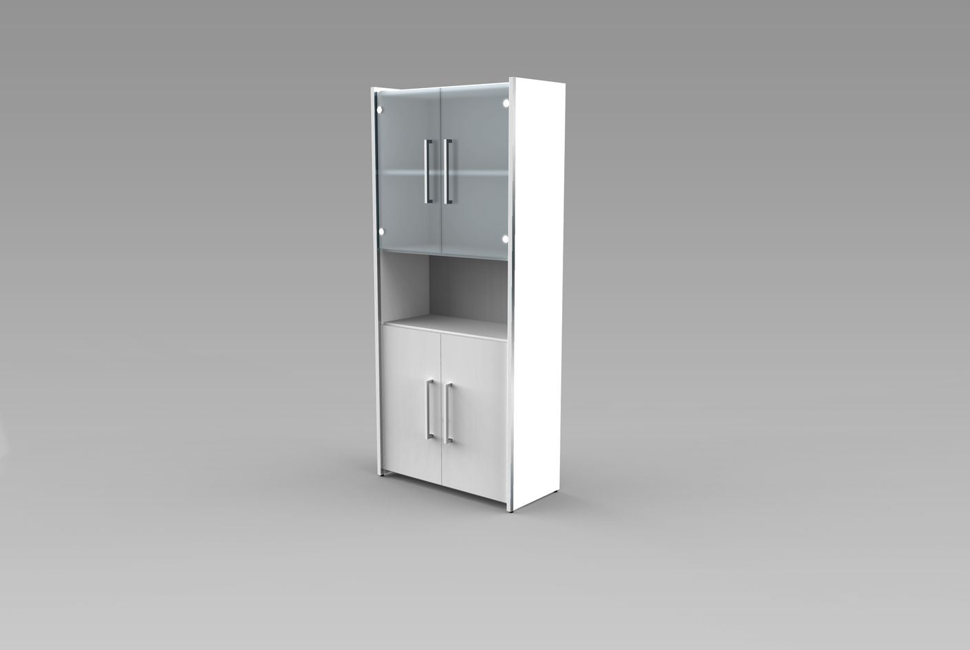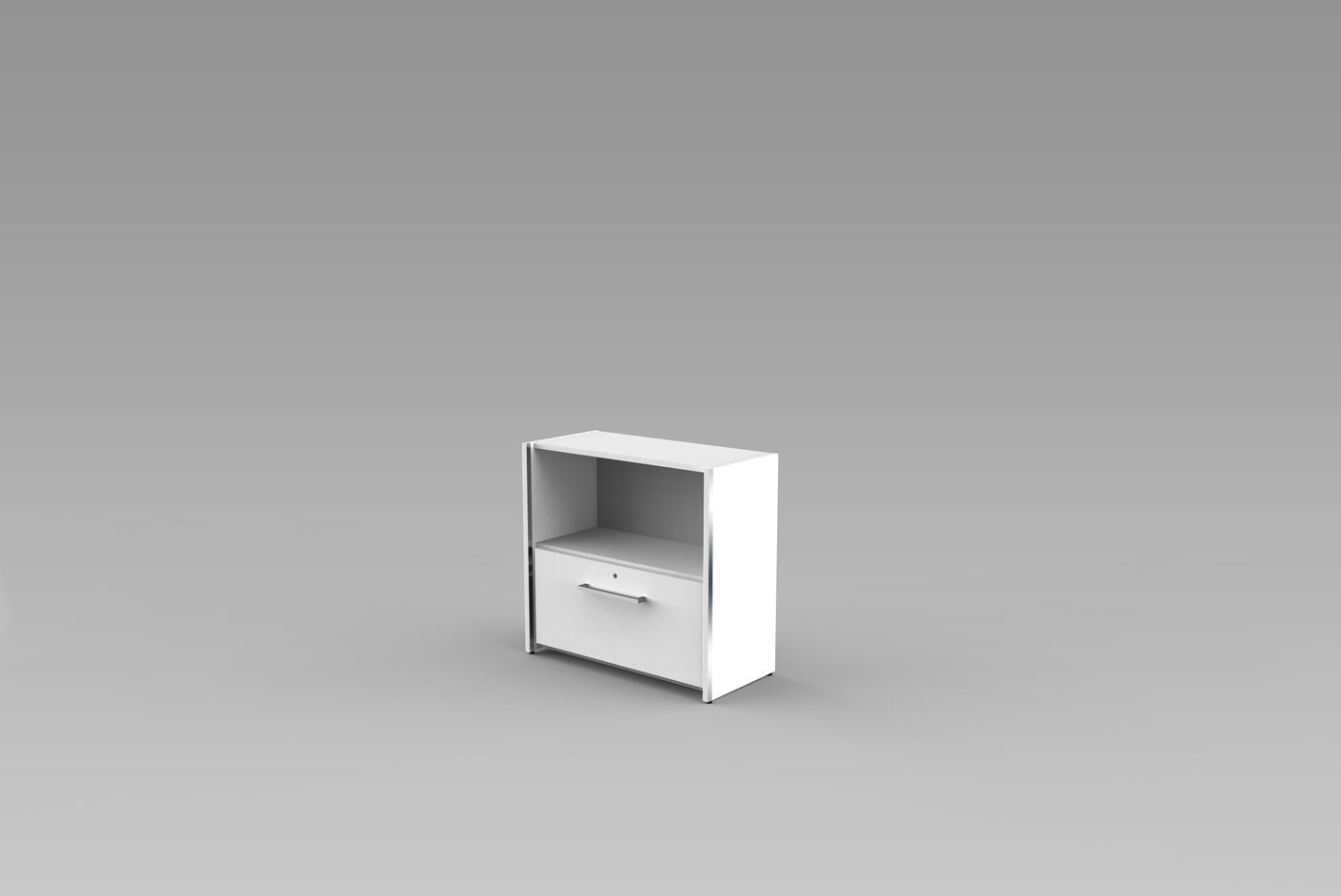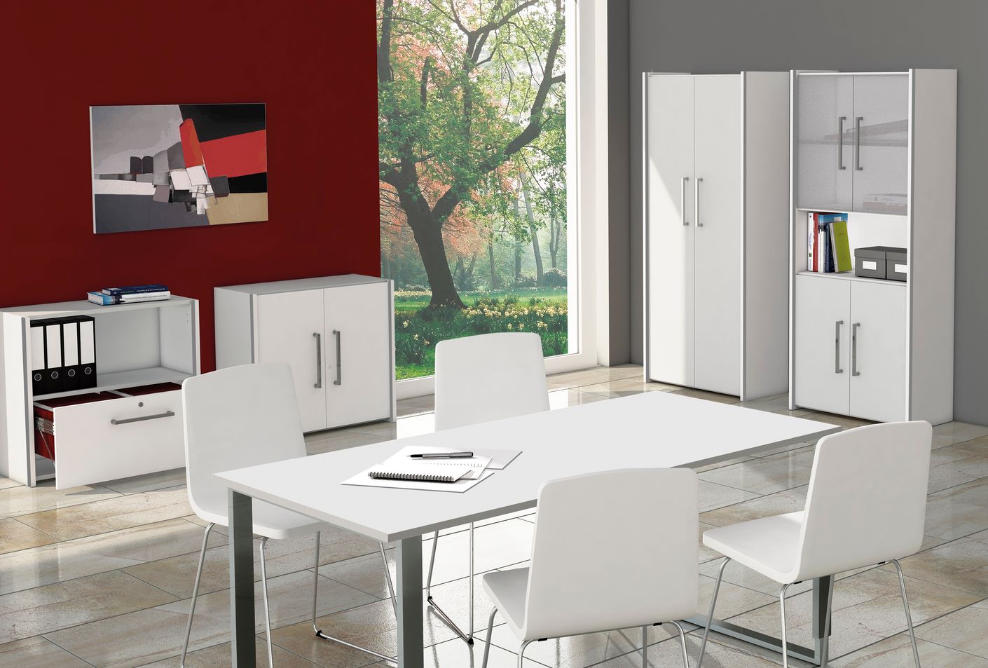 Die Regale können sowohl einzeln als auch aneinandergebaut aufgestellt werden (Ersparnis von Seitenwangen). Die Fachhöhen sind auf Ordnerhöhen abgestimmt. Der Regalkorpus ist stets in Weiß und wird zum Schrank, wenn er mit Vorbautüren versehen wird. Diese gibt es in Weiß, Wenge, Anthrazit und Glas. Die Regalwangen werden durch Edelstahlstreifen optisch aufgewertet, und passen so ideal zu den Tischgestellen. Die Türen sind mit Edelstahlgriffen versehen.