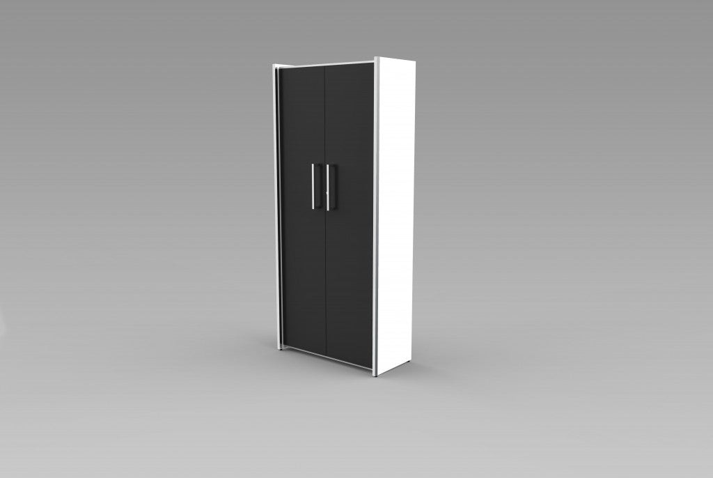 - 1 breites 2 OH Regal mit Holztürenpaar und 1 Fachboden.