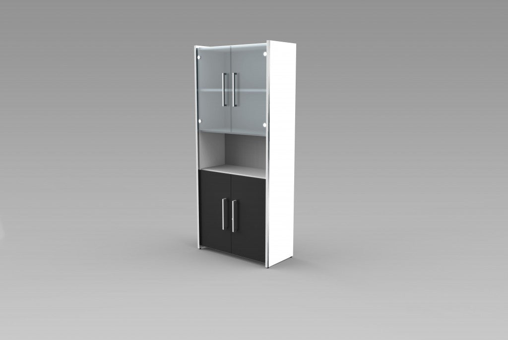 Die Regale können sowohl einzeln als auch aneinandergebaut aufgestellt werden (Ersparnis von Seitenwangen). Die Fachhöhen sind auf Ordnerhöhen abgestimmt. Der Regalkorpus ist stets in Weiß und wird zum Schrank, wenn er mit Vorbautüren versehen wird. Diese gibt es in Weiß, Wenge, Anthrazit und Glas. Die Regalwangen werden durch Edelstahlstreifen optisch aufgewertet, und passen so ideal zu den Tischgestellen. Die Türen sind mit Edelstahlgriffen versehen.