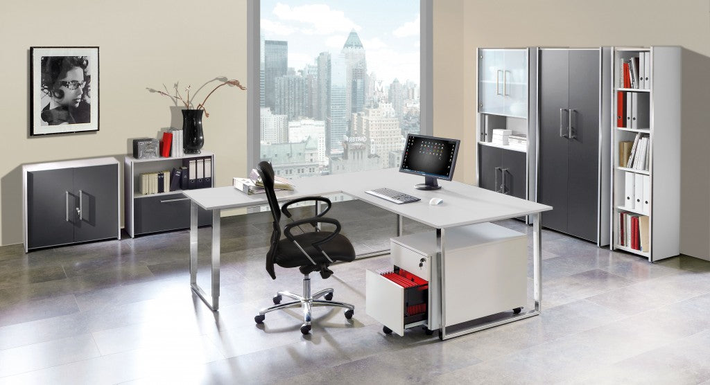 Container in Weiß haben eine Tiefe von 80 cm - für mehr Stauraum. Die obere Schublade ist mit einer verschiebbaren Materialschale für Stifte und Kleinutensilien ausgestattet. Gleichzeitig ist der Container mit Zentralverschluß, die Schubladen mit verdeckter Griffleiste, Selbsteinzug und mit einer Doppelauszugssperre versehen. Anstell-Container für Tische sind höhenverstellbar von 72-76 cm, wahlweise mit einer Oberplatte in weiß oder anthrazit. Der funktionelle Komplettarbeitsplatz beinhaltet zum Tischbereich ein Sideboard mit 2 Schiebetüren und mittig 3 Schubladen. Hinter den Türen befindet sich jeweils 2 Ordnerfächer.