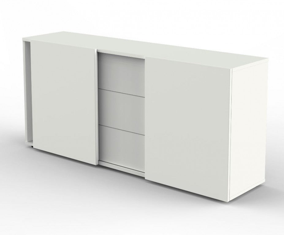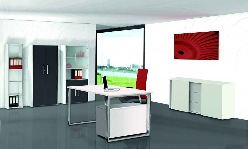 Container in Weiß haben eine Tiefe von 80 cm - für mehr Stauraum. Die obere Schublade ist mit einer verschiebbaren Materialschale für Stifte und Kleinutensilien ausgestattet. Gleichzeitig ist der Container mit Zentralverschluß, die Schubladen mit verdeckter Griffleiste, Selbsteinzug und mit einer Doppelauszugssperre versehen. Anstell-Container für Tische sind höhenverstellbar von 72-76 cm, wahlweise mit einer Oberplatte in weiß oder anthrazit. Der funktionelle Komplettarbeitsplatz beinhaltet zum Tischbereich ein Sideboard mit 2 Schiebetüren und mittig 3 Schubladen. Hinter den Türen befindet sich jeweils 2 Ordnerfächer.