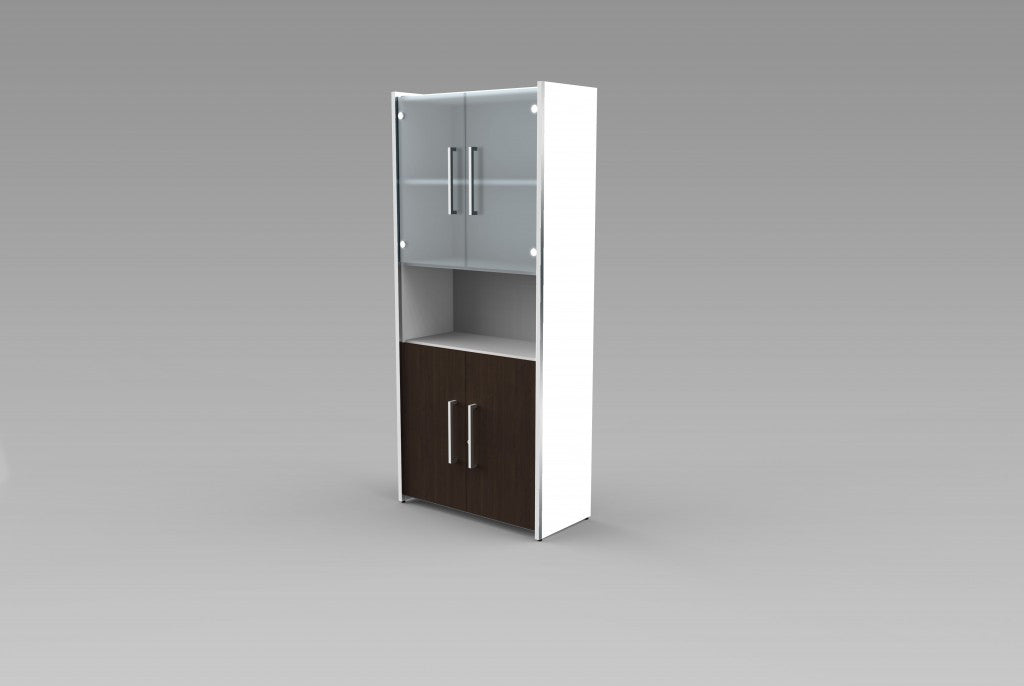- 1 breites Regal mit 1 Glas- und 1 Holztürenpaaren.