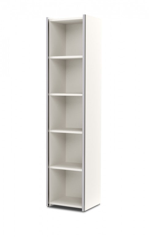 Die Regale können sowohl einzeln als auch aneinandergebaut aufgestellt werden (Ersparnis von Seitenwangen). Die Fachhöhen sind auf Ordnerhöhen abgestimmt. Der Regalkorpus ist stets in Weiß und wird zum Schrank, wenn er mit Vorbautüren versehen wird. Diese gibt es in Weiß, Wenge, Anthrazit und Glas. Die Regalwangen werden durch Edelstahlstreifen optisch aufgewertet, und passen so ideal zu den Tischgestellen. Die Türen sind mit Edelstahlgriffen versehen.
