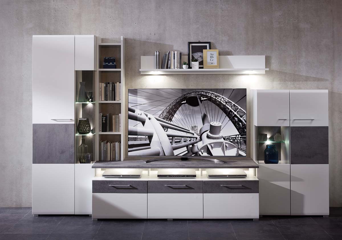 Gesamter Serienumfang: 2x Standvitrine, TV-Unterschrank, Sideboard, Couchtisch und Aufsatzregal