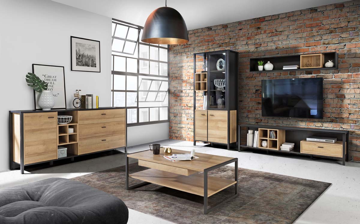 Gesamter Serienumfang: 2x Sideboard, 2x TV-Unterschrank, 4x Vitrine, Wandregal, Schrank, Couchtisch und Esstisch