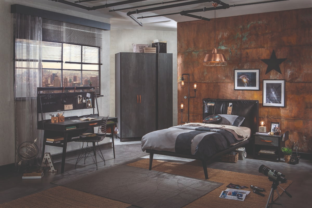Mit den fantasievollen Möbeln von Cilek ist das ganz einfach und preiswert möglich. Alles ist bei dieser Möbelserie optimal auf die Belange junger Menschen zugeschnitten. Das Bett verfügt über ein Kopfteil aus dunklem Leder. Nachttisch, Kommode und Kleiderschrank sind in düsteren Farben gehalten und unterstreichen den morbiden Charme der Möbel.