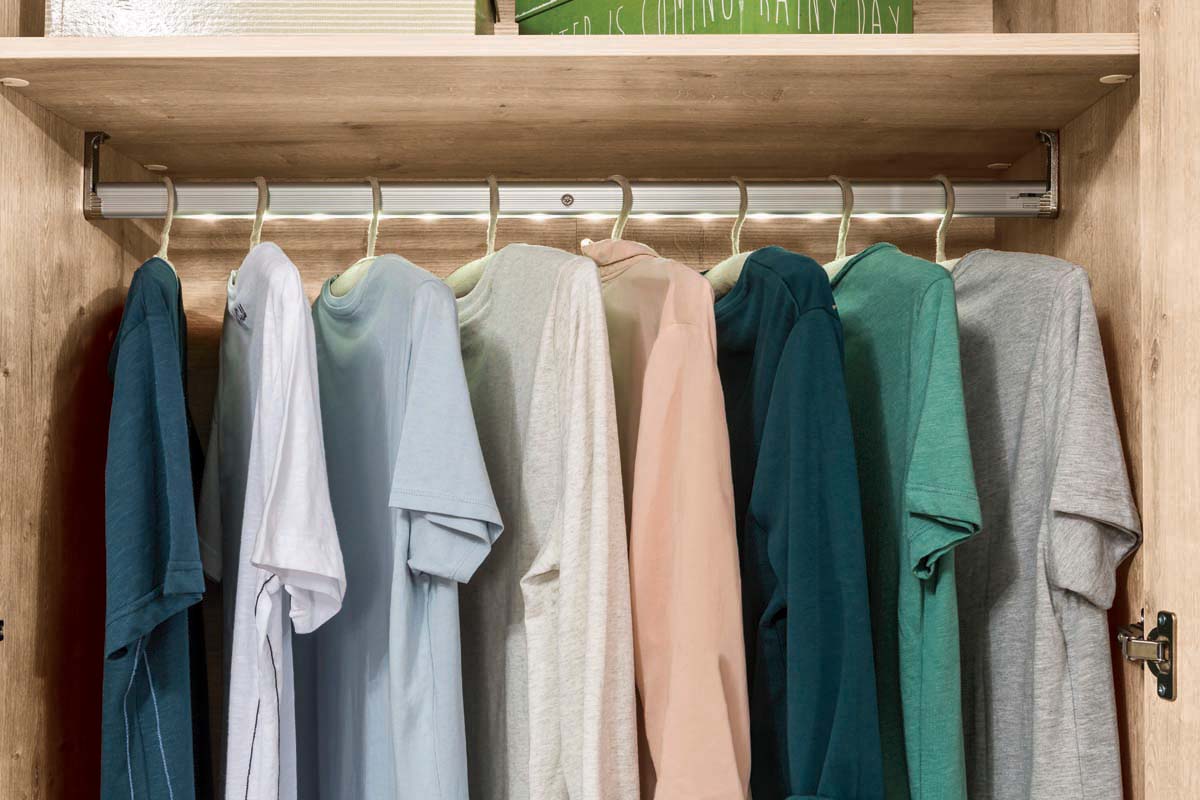 - links: 1 Kleiderstange mit Beleuchtung, 2 Fachböden