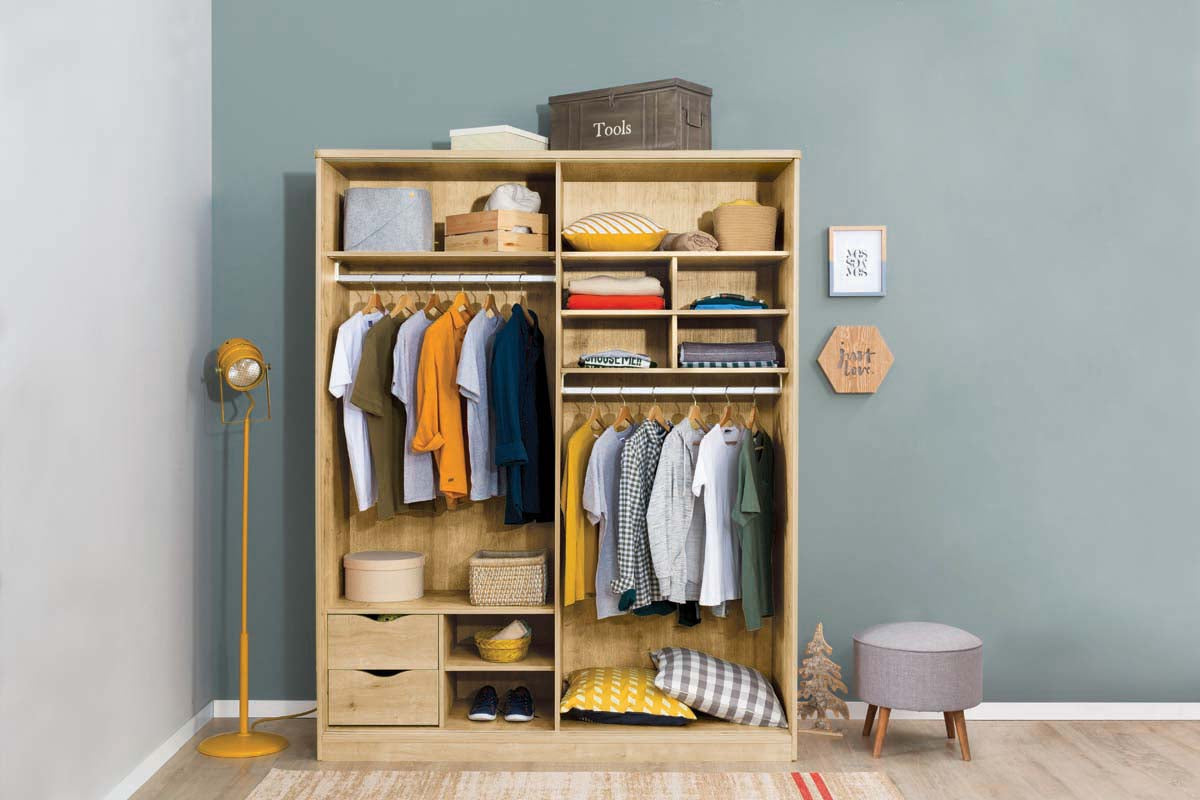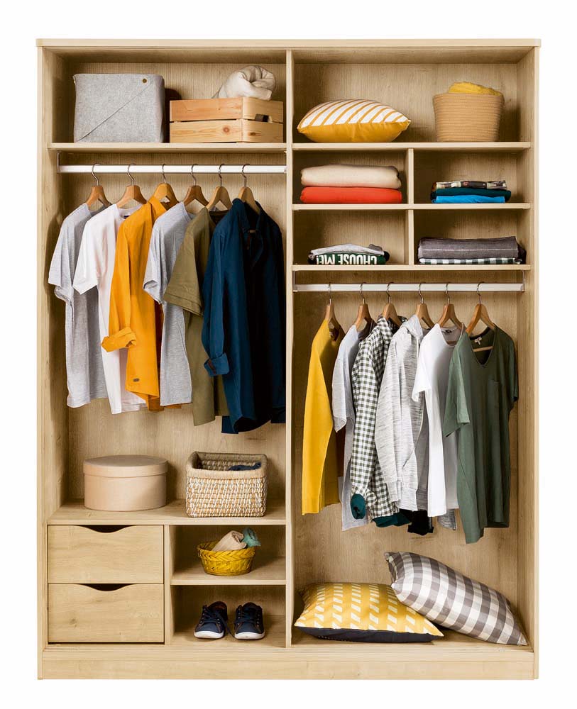 - links: 1 Kleiderstange, 3 Fachböden, 2 geschlossene Schubladen