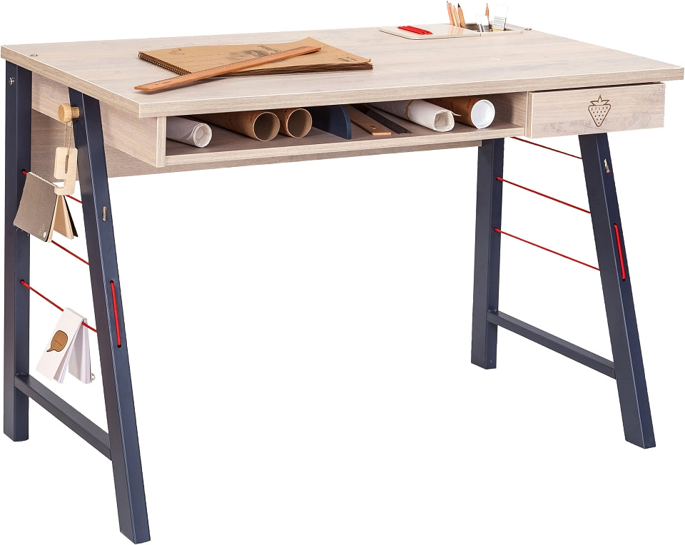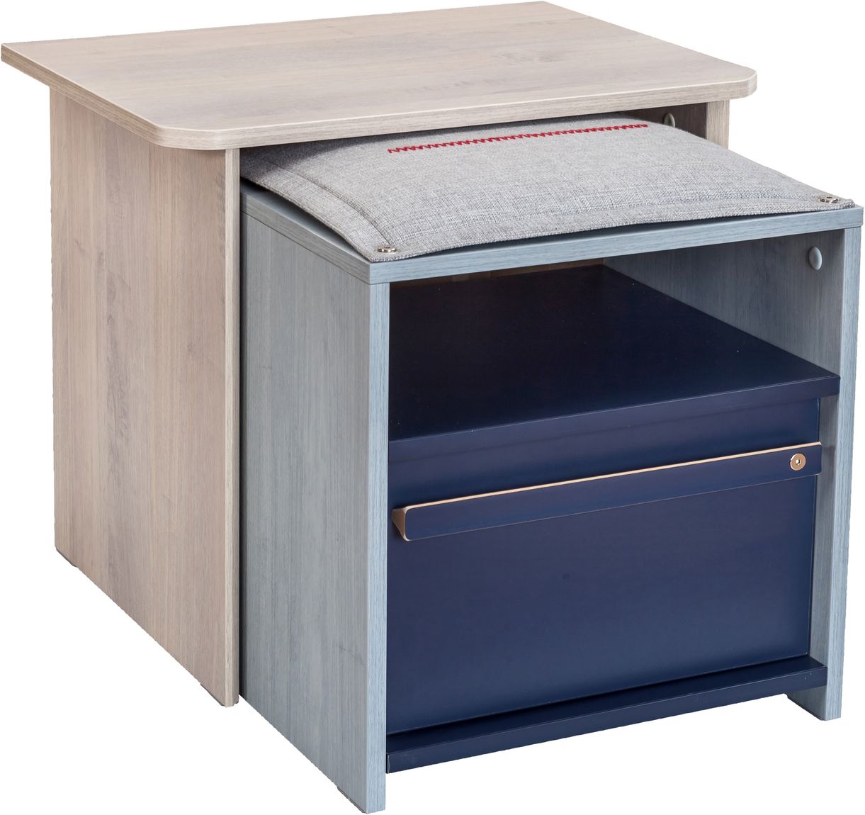mit 1 Schubkasten, 1 offenen Ablagefach, 1 Sitzkissen und 1 Tisch.