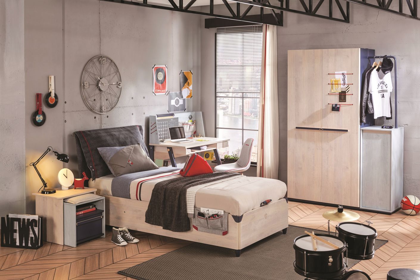 Die Serie TRIO ist ein stilvolles Jugendzimmer für Jungen ab dem 10 Jahren. Die verwendeteten MDF-Platten sind feuchtigkeitsbeständig, strapazierfähig, sowie extrem resistent gegen Kratzer. Die Kanten und abgerundeten Ecken sind mit einer 2mm starken PVC-Folie versehen. Sämtliche Beschläge sind aus Aluminium gefertigt. Sehr widerstandsfähigen Griffe aus natürlichen Holz. Die Möbel sind TSE zertifiziert.