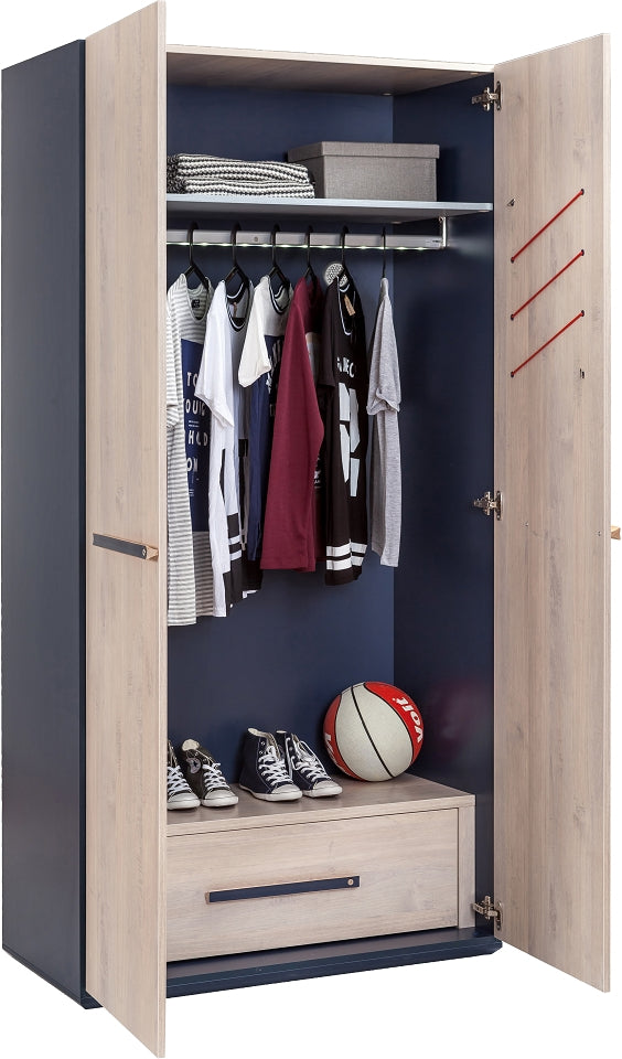 mit 2 Türen. Dahinter befindet sich 1 Schublade, 1 Ablageboden und 1 LED-Beleuchtete Kleiderstange.