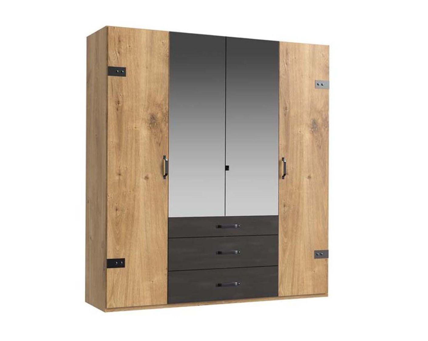 Detroit 4-türiger Kleiderschrank mit Spiegel Plankeneiche / Schwarz
