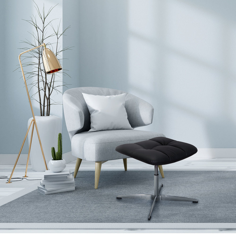 - Das Designer-Fußkreuz aus Edelstahl mit bodenschonenden Kunststoffgleitern sorgt für einen sicheren Stand