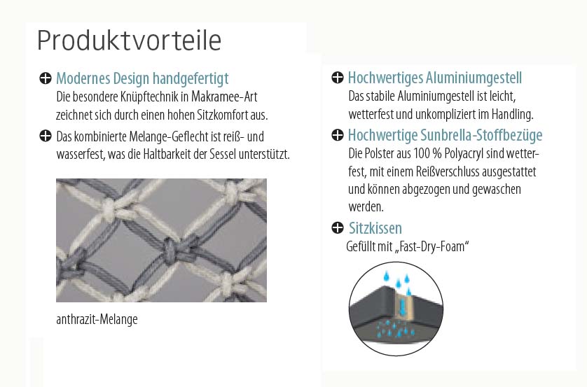 - die besondere Knüpftechnik in Makramee-Art zeichnet sich durch einen hohen Sitzkomfort aus