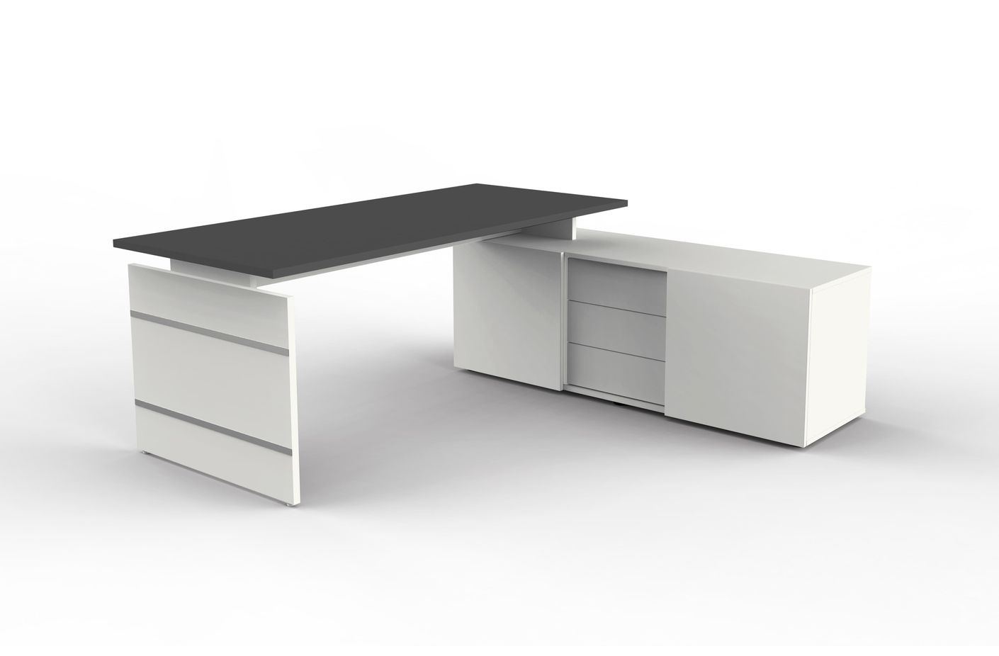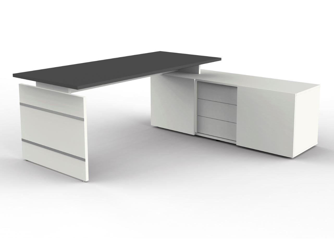 Das neue Büromöbelprogramm mit Applikationen in Alusilber und trendigen Dekoren. Sie können zwischen 3 Tischplattendekoren ( Weiß, Grafit oder Wenge) und 4 Gestellformen (C-Fuß-Gestell Typ B, C und D oder 1 Wangengestell Typ A) wählen. Optional können die Schreibtische mit einer Knieraumblende und einer Sichttrennwand werden. Zudem bietet das C-Fuß-Gestell Typ B und C und das Wangengestell Typ A die Möglichkeit die Tischplatte in der Höhe einzustellen.Stauraum für die Verkabelung bietet der serienmäßig vorhandene Kabelkanal. Zur Vergrößerung der Arbeitsfläche oder für kleinere Besprechungen ergänzen Sie die Schreibtische durch entsprechende Anbautische. Als Ergänzug stehen weiße Rollcontainer mit großem Stauraum, da 80 cm tief, zur Verfügung. Wählen Sie hier zwischen 3 Schubladen oder 1 Schublade und Hängeregistratur. Vielfältige Kombinationsmöglichkeiten bietet der Regalbereich. Der Korpus, generell in weiß mit feinem alusilber-Akzent an der Vorderkante, kann durch Türen in 2 OH oder 5 OH , aber auch durch Schubladen für Hängeregistratur vervollständigt werden.